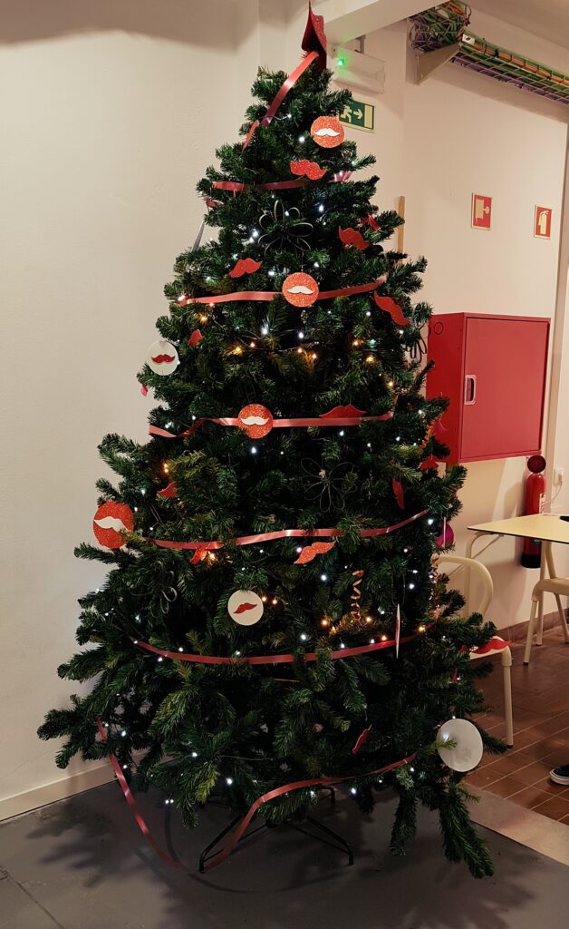 Este ano, a árvore não traz apenas os tradicionais adornos, mas também elementos especiais que representam o projeto “Pessoa(s) em Movimento!” – com bigodes e laços, símbolos que refletem o nosso compromisso com a diversidade e a inclusão.